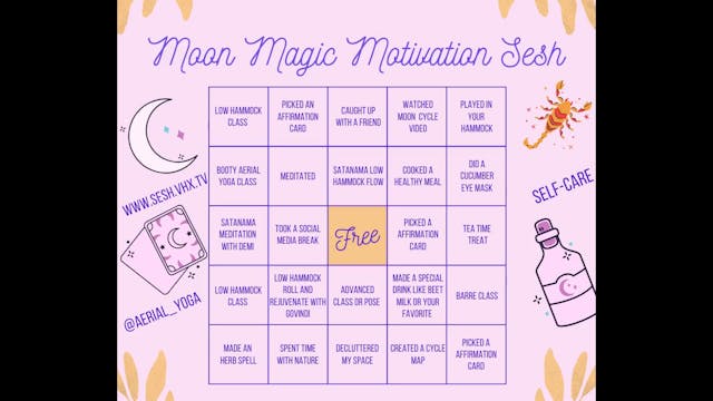 From May 7 to June 7, use the below *Moon Magic Motivation* bingo board on Instagram, and of course, be sure to tag TMac @aerial_yoga! For each line you “cross off” on the bingo board, you will receive an entry to win one of the prizes below: